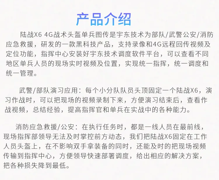 陸戰(zhàn)X6 4G戰(zhàn)術頭盔單兵無線圖傳,可以為應急通信應用提供事發(fā)現(xiàn)場的視頻通信指揮調度功能,實現(xiàn)應急現(xiàn)場與后方本部的視頻通信,有效地滿足出現(xiàn)突發(fā)性、群體性和災難性事件時的應急指揮調度需要。
